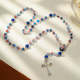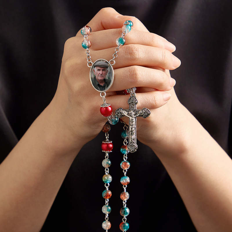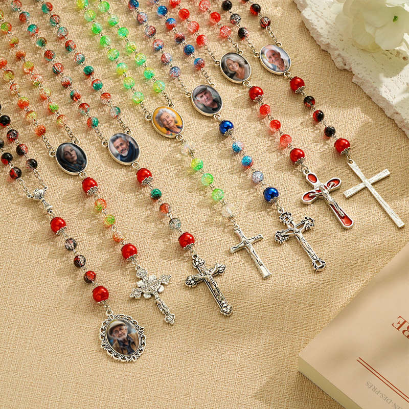 Custom Rosary Beads Cross Necklace Sentimental Memorial Gift Prayer Personalised Acrylic Explosion Beads Long Style Necklace with Photo